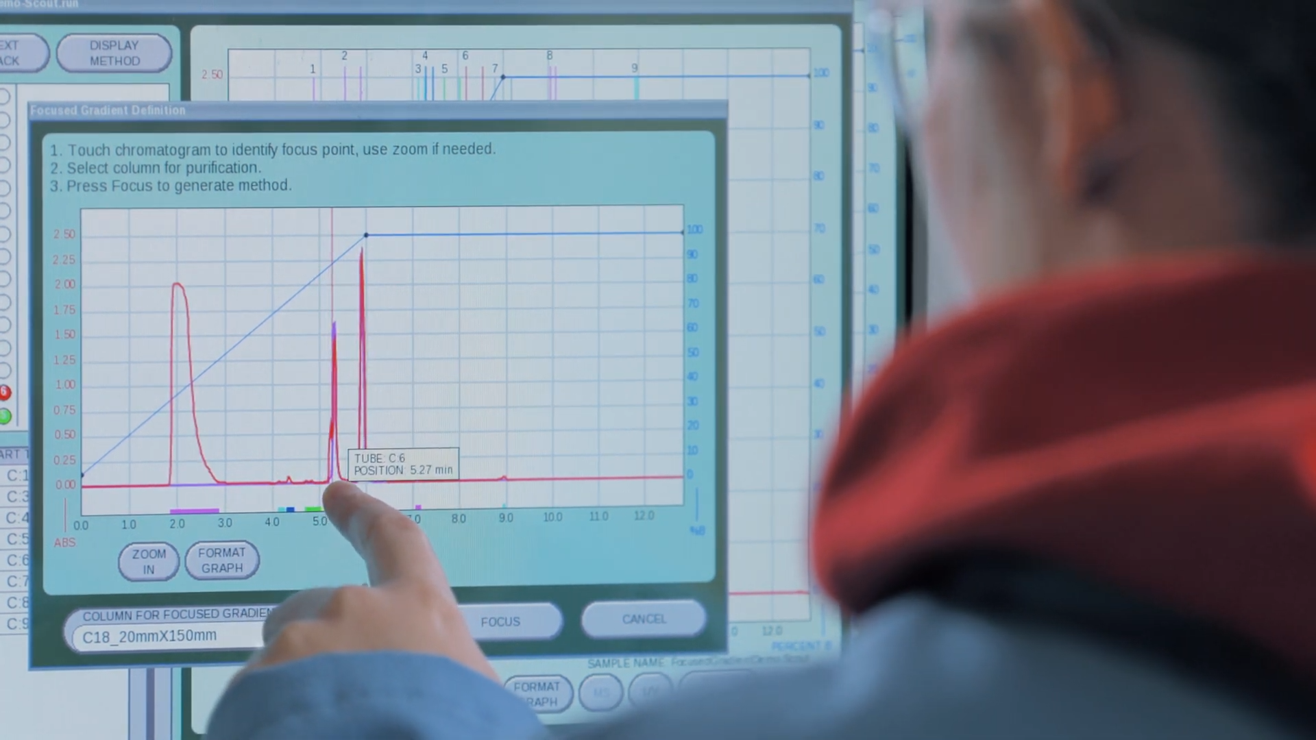 Then in 2019, to make the process even faster and easier by avoiding all manual calculations, and building further upon the work of Jack Silver, we released our automated Focus Gradient Generator tool [2] within the PeakTrak software on the ACCQPrep HP150 system. This tool allows a user to perform a scouting run on the HP150, select the peak of interest, and have PeakTrak respond instantly with an optimized focused gradient. And it automatically scales methods to larger prep columns of the same chemistry. With the improved resolution of the optimized method, higher loads can then be injected for further runs on the same prep column.
